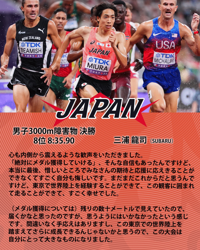 2025年9月15日、東京世界陸上男子3000m障害決勝で、日本記録保持者の三浦龍司(SUBARU)が8分35秒90で8位入賞を果たした一方、最終障害でのケニア選手との接触に対する抗議が棄却されたことが明らかになった。