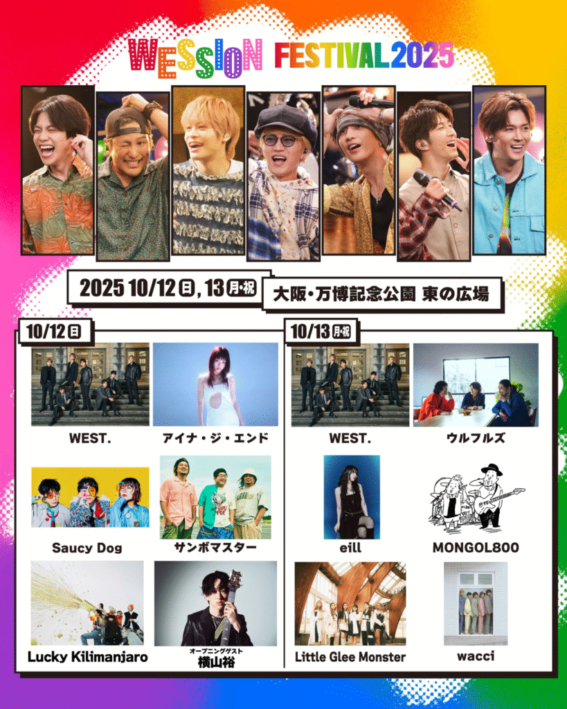 WOWOW × WEST. "WESSION" WESSION FESTIVAL 2025WOWOWとWEST.の新たなコラボ“WESSION“始動!WEST.がお届けするレギュラー音楽番組が6月29日(日)午後9時よりスタート!さらに10月にはWEST.初の主催野外フェスの開催も決定! WEST.主催フェス『WESSION FESTIVAL 2025』オープニングゲストに横山裕 タイムテーブル公開(オリコン) - Yahoo!ニュース7人組グループ・WEST.が10月12日、13日に大阪・万博記念公園で開催する主催フェス『WESSION FESTIVAL 2025』において、12日のオープニングゲストとして横山裕と石原慎也(S WEST.、初主催音楽フェス「WESSION FESTIVAL 2025」新ヴィジュアル公開 - TOWER RECORDS ONLINEWEST.、初主催音楽フェス「WESSION FESTIVAL 2025」新ヴィジュアル公開 - タワーレコード 【WESSION FESTIVAL 2025】オープニングゲストに横山裕が決定!さらに、タイムテーブル決定!オフィシャル最終先行もスタート!会場マップも公開!株式会社WOWOWのプレスリリース(2025年9月18日 11時00分)【WESSION FESTIVAL 2025】オープニングゲストに横山裕が決定!さらに、タイムテーブル決定!オフィシャル最終先行もスタート!会場マップも公開!